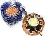 Volcano 6Cu (рис. 3) на первый взгляд смахивает на Volcano 5. Но на самом деле между ними есть принципиальное отличие. Как уже догадались все любители химии, вставка Cu в названии этих моделей кулеров используется неспроста: в радиаторы данных кулеров, в алюминий, внедрена медная вставка — в центральной части основания радиатора расположен медный диск диаметром 40 мм (рис. 4). Купрум (Cu) — это и есть та самая медь, если выражаться человеческим языком. Основная цель нововведения ясна: медь имеет большие коэффициенты теплопроводности и температуропроводности, чем широко употребляемый алюминий. Конечно же, в случае применения медных вставок возникают проблемы теплообмена в местах сопряжения этих вставок с собственно основным алюминиевым радиатором, однако производители более-менее успешно справляются с решением этой проблемы, в частности используя метод холодной сварки металлов.
