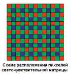 Более практичный и экономичный способ определения цвета пикселей состоит в размещении светофильтров в некоторой последовательности непосредственно перед фотоэлементами. Заполнив сенсор множеством красных, синих и зеленых пикселей вполне возможно получить достаточную информацию о цветности конкретного участка изображения. Качество распознавания повышается, если дополнительно учитывать информацию от соседних пикселей, применяя интерполяцию. О пикселях поговорим попозже, пока для простоты считайте одним пикселем каждый фотоэлемент.