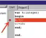 Но вернемся командам пошагового выполнения программы. После того как произошла остановка на точке останова, с помощью команд Trace Over (F8) и Trace Into (F7) можно выполнять программу далее построчно. Эти команды отличаются тем, что первая при пошаговом выполнении не затрагивает тело процедур и функций, а вторая — наоборот. Если в программе есть другие точки останова — нажатием F4 (Run To Cursor) сразу осуществляется выполнение программы до ближайшей из них.