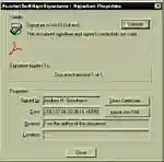 Сертифицированный файл можно проверить на соответствие подписи. Это вполне реальное желание заказчика (пользователя, покупателя, заполнителя анкеты). Для этого достаточно выбрать инструмент Digital Signature, райт-кликнуть на области подписи, вызвать Свойства и нажать кнопку Validate. В этом же диалоге вы получите результат исследования файла (Рис. 3).