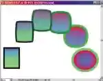 Рассмотрим преобразование, называемое в программе превращением (Blend). Оно позволяет по нескольким объектам различной формы и окраски построить серию промежуточных объектов с характеристиками, обеспечивающими плавный переход от одних объектов к другим. Проиллюстрируем преобразование Blend примером. На Рис. 4 изображен ряд объектов, представляющих собой промежуточные стадии трансформации от прямоугольника, расположенного слева, к кругу справа. Обратите внимание, что все характеристики промежуточных объектов — форма, цвет обводки и заливка — как бы интерполируют свойства исходных фигур. Вид промежуточных объектов широко варьируется: пользователь сам может задать количество промежуточных фигур, порядок их перекрытия и способ вычисления промежуточных цветов. Траектория, по которой располагаются промежуточные фигуры, по умолчанию является прямолинейным отрезком, но по желанию объекты можно разместить вдоль произвольной кривой, как в нашем примере.