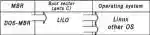 Во время инсталляции Linux программа установки спросит, куда устанавливать LILO. Давайте посмотрим, какие у нас варианты. Windows загружается в такой последовательности (Рис. 1). Из рисунка видно, что возможны два варианта установки — в MBR (Рис. 2) и в boot record раздела, куда установлена Windows (Рис. 3). Предпочтительным вариантом является установка в MBR (т.е. выбираем hda). Кстати, если вы просто удалили раздел с Linux, то восстановить MBR можно и в DOS, просто наберите fdisk /mbr.