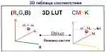 3D Look Up Tables — 3D-таблицы согласования цветов. Зачем они нужны? Одним из важнейших процессов в технологии струйной печати является пересчет цветов при переходе из одной цветовой модели в другую. Как уже упоминалось выше, многие устройства компьютера, например, такие как сканер или монитор, работают с цветовой моделью RGB (где базовые цвета Red (красный), Green (зеленый) и Blue (голубой)). (Вас удивляет, как можно сочетанием этих трех цветов получить, скажем, черный цвет? Да очень просто — если точка на мониторе будет светиться всеми тремя RGB-цветами с нулевой яркостью, то выйдет как раз черный цвет :-). Точно так же и сканер — наличие отсутствия :-) всех трех цветов на его приемном элементе воспринимается как черный). Поэтому и информация, поступающая с компьютера на принтер, как правило, в цветовой модели RGB. Однако цветной струйный принтер «предпочитает» цветовую модель CMYK. (И черный цвет ему уже нужен, ибо, например, лист бумаги, в отличие от экрана монитора, белый, а не черный).