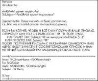 Автоответ — важная составляющая всей системы. Он содержит ключевую строку для сортировки сообщений об ошибках доставки, включает в себя стандартные слова для отписки от спама (а вдруг получится). А также информирует авторов не прошедших контроль писем о необходимости повтора сообщения с указанием пароля в теме письма. Кроме того, в автоответе приводится копия оригинального письма (без приложений). Пример смотрите
