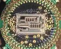 Сборка микросхем — это самый трудоемкий процесс (читай, дорогостоящий). Он плохо поддается автоматизации и, кроме того, имеет низкую технологическую производительность — каждый кристалл обрабатывается по отдельности. Кристаллы надежно закрепляются в корпусе, чаще всего с помощью теплопроводящего клея или эвтектического сплава. Выводы корпуса с контактными площадками на поверхности кристалла соединяются с помощью очень тоненьких (в диаметре меньше 0.1 мм) эластичных проводников (рис. 3) из алюминия, меди или золота (последний материал предпочтительнее). Соединения выполняются при помощи ультразвуковой сварки (если один или оба материала соединения — алюминий) или пайки (обычно золото).