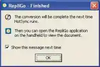Теперь попробуем перенести любой файл в КПК. Открываем его в родительском приложении, «печатаем» его на принтере RepliGo. Если нужно, настраиваем параметры нашего виртуального принтера, жмем OK и приходим вот к такому окну (Рис. 3). В поле Name выбираем имя для нового файла, а в уже знакомых строках User и Location — пользователя КПК и место установки соответственно. После этого появляется окно, в котором отображается процесс конвертирования. Завершается он вот таким сообщением (Рис. 4).