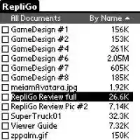 В меню File есть такие пункты: Open открывает для просмотра выделенный документ; Beam пересылает его через инфракрасный порт на другой КПК (причем поддерживаются как «наладонники» на базе PalmOS, так и из лагеря PocketPC, так как RepliGo использует универсальный кросс-платформенный формат для своих баз; единственное условие при этом — наличие копии программного обеспечения на КПК-получателе); Send отсылает документ по Bluetooth-интерфейсу (да-да, есть поддержка и этого стандарта для владельцев Palm Tungsten T, новых Sony Clie и PocketPC с дополнительными аксессуарами); Delete, как нетрудно догадаться, удаляет файл из памяти КПК. Дополнительные пункты Select All и Clear all соответственно выделяют все документы или полностью снимают выделение. Выделять отдельные файлы можно и при помощи переключателя напротив каждого из них.
