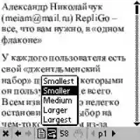 А сейчас обращаем наш взор в самый низ экрана КПК — на панель навигации RepliGo. Самая первая кнопка (с изображением крестика) закрывает текущий документ и возвращает нас к окну со списком всех установленных в память устройства файлов. Две следующие стрелочки, направленные в противоположные стороны, соответствуют пунктам Back и Forward в выпадающем верхнем меню программы. За ними идет пиктограмма в виде листа бумаги с надписями, нажмите ее — и вы перейдете в «оригинальный» режим просмотра документа. Пиктограмма чуть правее (стрелочка, указывающая направление движения глаз при чтении), наоборот, переключает программу в «поточный» режим; если задержать на ней стилус чуть дольше обычного, то появится небольшое окошко, в котором можно будет задать размер шрифта. Теперь смотрим чуть правее и видим число, соответствующее уровню масштабирования документа; опять же, при нажатии на него в «оригинальном» режиме появляется выбор из возможных дискретных уровней увеличения. Следующая пиктограмма — «рука», с помощью которой можно перемещаться в пределах документа без использования полос прокрутки. За разграничивающей чертой находится показатель текущей страницы и небольшие стрелочки по обе стороны от него для их переключения. Самый последний значок появляется только в тех случаях, когда ваш КПК «задумывается» над выполняемой операцией — аналог песочных часиков в Windows.