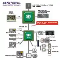 Самое кардинальное отличие чипсета SIS 746 от его предшественника заключается в том, что он (рис. 1) опять начал производиться в двухмостовом дискретном варианте, в то время как SIS 745 в одной схеме совмещал южный и северный мосты. Северный мост обзавелся поддержкой AGP 3.0 в режиме 8Х, а также поддержкой памяти DDR333. Что касается южного моста, то SIS решила выпустить две его версии —SIS 936 и облегченный вариант SIS 963L. Это самое облегчение выражается исключительно в отсутствии контроллера шины IEEE1394A (FireWire). Что же касается непосредственно возможностей южного моста, то нужно отметить следующее: организация работы 4-х IDE-устройств ATA133 (в SIS 745 максимальным режимом был ATA100), 6 портов USB 2.0 (в SIS 745 только USB 1.1), поддержка шестиканальных кодеков AC’97. Также присутствует поддержка сетевых контроллеров 10/100 LAN или 1/10 HomePNA, осуществляемая посредством интерфейса MII. Остальная обвеска вполне стандартная. Сама SIS в качестве набора рекомендует связку «северный мост + SIS 963L», видимо, чтобы подкупить производителей материнских плат невысокой ценой такого комплекта. Тогда как SIS 963 стоит подороже, да и востребованность шины FireWire широкими массами не столь однозначна (рис. 2). Связь между мостами осуществляется при помощи шины MuTIOL 1G, пропускная способность которой осталась на уровне 1 Гб/с. Похвально, потому как, одно дело, когда такая скорость была достигнута в одночиповом решении, и совсем другое — получить подобные результаты при наличии проводников достаточной длины, соединяющих отдаленные чипы.