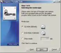 Новая утилита, появившаяся в 5-й версии пакета, представляет собой расширение возможностей Steganos Safe и направлена на сохранение конфиденциальных данных по уже упомянутому выше принципу, с той лишь разницей, что все необходимые данные могут быть зашифрованы и записаны в дальнейшем на CD-R/RW, DVD-диски (при наличии соответствующих приводов), и распакованы без применения какого-либо дополнительного программного обеспечения. «Портативный сейф»создается с помощью мастера, включающего 6 последовательно выполняемых действий: выбор типа и размера носителя для переноса зашифрованных данных — CD-R, DVD (рис. 3); установка пароля, выбор логического диска, на котором будет создан временный виртуальный, выбор буквы для диска, перенос данных на созданный виртуальный диск и создание в итоге папки на Рабочем столе, содержащей файл с зашифрованными данными и инсталляционный пакет для распаковки этих данных. Затем эта папка может быть записана на выбранный ранее носитель и спокойно удалена, а процесс повторятся необходимое количество раз.
