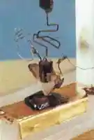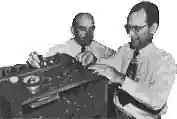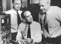 А тем временем в области электроники случилось еще одно знаменательное происшествие — были созданы первые транзисторы. Этому событию предшествовала 10-летняя работа, начатая еще в 1938 году физиком-теоретиком Уильямом Шокли. И вот в конце 1947 года Джоном Бардином, Уолтером Браттейном и Уильямом Шокли (рис. 14) был представлен первый транзистор (рис. 15). Этот маленький прибор смог совершить настоящий переворот в вычислительной технике. Применение транзисторов в качестве элементов ЭВМ позволило уменьшить размеры компьютеров в сотни раз и значительно повысило их надежность.