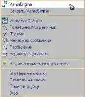 После запуска файла в системном трее появляется пиктограмма программы. Если кликнуть на ней левой кнопкой — откроется основная программа, если правой — меню, как на рисунке 12. Из него Вы можете запустить все приложения, входящие в состав Venta Fax, принять факс, поднять трубку, чтобы поговорить с абонентом, включить автоматический прием.