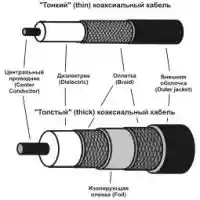 Существует несколько разновидностей коаксиала (рис. 5). Во-первых, это, так называемый, «толстый» кабель RG-8 или RG-11 (RG — сокращение Radio Grade, т.е волновод), на базе которого на заре развития локальных сетей создавались сети Ethernet. Но на сегодняшний день его почти вытеснила другая разновидность — «тонкий» коаксиальный кабель RG-58, который дешевле, а сети на его основе ничуть не уступают по производительности вышеупомянутым «толстым» собратьям.