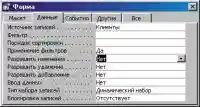вкладка «Данные»: поле Ограничиться списком должно иметь значение Да (Рис. 4.6). Это позволит вести поиск только среди реально существующих записей. Поле Данные (Рис. 4.1) должно иметь пустое значение (необходимо удалить оттуда Страна), иначе выбор из списка приведет к изменению значения данных в таблице. С полем Название поступим так же и изменим все свойства аналогичным образом. Вот только источник данных будет другой, каждый раз новый.