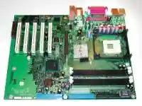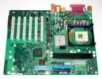 Возможности данной платы очень схожи с предыдущей. Работа с процессорами Pentium 4/Celeron (шина 400/533 МГц), установка до 2 Гб памяти DDR333/266, 6 PCI-слотов. Но давайте посмотрим, каким же образом была упрощена эта плата. Сразу бросается в глаза наличие двухканального стабилизатора напряжения питания процессора, вместо трехканального на D1547, правда, количество и емкость конденсаторов осталось прежним. Вряд ли кто-то соберется ставить в такую систему процессор с частотой 3 ГГц, поэтому большой задел прочности делать нет необходимости.