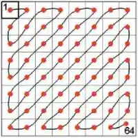 Интересно, что каждый такой массив 88 пикселей обрабатывается не построчно, как в большинстве других форматов, а зигзагом, по диагонали, начиная от верхнего левого угла и заканчивая нижним правым (Рис. 4). Сделано это в основном для того, чтобы уравнять качество передачи вертикальных и горизонтальных линий.