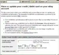 Но вернемся к регистрации. Итак, предположим, вы — уже зарегистрированный пользователь (если нет, то зарегистрируйтесь, это бесплатно). Вы ввели в регистрационной форме свои логин и пароль и нажали кнопку. После этого, как ни странно, перед вами появится форма с полями логина и пароля, только в поле «логин» ваш никнейм уже будет прописан. Таким образом eBay пытается удостовериться в том, что вы действительно тот, за кого себя выдаете. Повторно указав пароль и нажав кнопку Continue, вы попадете на страницу введения данных кредитной карты (рис. 1). После того, как вы пропишите эти данные и подтвердите их нажатием кнопки, должно появиться окно подтверждения приема карты (рис. 2).
