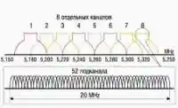Однако 54 Мбит/с — это еще далеко не все преимущества метода OFDM. Нужно хотя бы вспомнить, что одновременная передача данных возможна по восьми независимым каналам, а это 432-Мбит/с суммарной пропускной способности, против 33 Мбит/с по методу DSSS (3 канала по 11 Мбит/с). Перечисляя достоинства метода, упомянем о его хорошей помехозащищенности в условиях многолучевого отражения сигнала, а также возможности работы на отраженном сигнале (нет необходимости прямой видимости между источником и приемником).