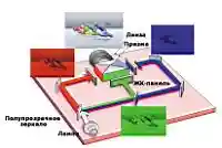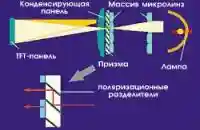 Так вот, при таком «раскладе» в ранних конструкциях проекторов весь горизонтально поляризованный свет просто отражался поляризатором. То есть добрая половина светового потока лампы подсветки просто растрачивалась впустую (соответственно, половина потребляемой лампой электроэнергии шла буквально на обогрев окружающего пространства). В итоге, на выходе проектор обеспечивал яркость менее половины от изначальной ламповой. Что, вполне естественно, вело к неудовлетворительно низкой яркости первых моделей проекторов.