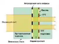 Еще одна проблема ЖК-матриц заключается в том, что у них эффективная площадь пикселя меньше его реальной площади (рис. 13). Поэтому, как мы уже указали выше, часть светового потока поглощается непрозрачной частью матрицы. Можно ли избежать этого? Конечно, можно. Для увеличения светового потока через прозрачную часть пикселей ЖК-матрицы используется технология массива микролинз (Micro Lens Array). Она позволяет значительно снизить потери светового потока, проходящего через ЖК-матрицу. Принцип ее работы заключается в следующем. Световой поток от лампы подсветки падает на массив микролинз (рис. 14). Каждая микролинза фокусирует попавший на нее свет в центральную прозрачную зону расположенного за линзой пикселя (рис. 15). Таким нехитрым образом удается до полутора раз повысить количество света, беспрепятственно проходящего сквозь ЖК-панель.