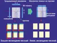 Кроме того, все современные проекторы, созданные на основе «старой» жидкокристаллической технологии, имеют по три ЖК-панели (рис. 16, 17). Каждая из которых отвечает за формирование картинки для одного из трех базовых цветов изображения — красного, зеленого и синего. Для чего это делается? Использование трех ЖК-матриц обеспечивает более высокое качество изображения и яркость, чем это можно достигнуть в одноматричных проекторах. Как же так, скажете вы, ведь в этом случае свет вынужден проходить не через одну, а сразу через три матрицы! Каким образом яркость в результате окажется выше? А выше она будет потому, что, в отличие от одноматричных проекторов, отпадает необходимость использовать цветовой фильтр, более просто решаются проблемы с тем, чтобы одновременно сфокусировать световой поток красного, зеленого и синего цветов в одну точку. Конечно же, чтобы получить высокоточную фокусировку всех трех световых потоков, положение трех ЖК-панелей должно быть очень точно отрегулировано. Конструкторам нельзя забывать и о том, что механические (в т.ч. в ходе транспортировки), а также тепловые (в ходе работы устройства) воздействия приводят к смещению положения ЖК-панелей. Результатом чего может стать неприятный эффект несовпадения картинок различного цвета на экране или неверная фокусировка одного или нескольких цветов (то есть изображение в таких случаях будет казаться смазанным или расплывчатым). Избежать ухудшения характеристик проектора в процессе транспортировки и эксплуатации помогает технология панель на призме (Panel On Prism). Последняя применяется как для обеспечения стабильных оптических характеристик проекторов, так и позволяет уменьшить физические размеры устройств. В некоторых моделях проекторов зазор между ЖК-матрицей и призмой может доходить до 1.2 см. При использовании же технологии «панель на призме», в результате точной оптической настройки, прочно закрепляются на прилегающих призмах и не могут сместиться при внешних воздействиях. Этот подход позволяет избежать эффекта несовпадения на экране изображений в красном, синем и зеленом цветах (рис. 18).