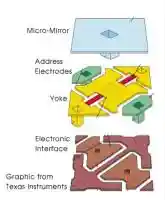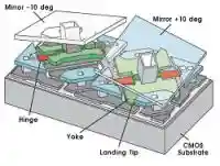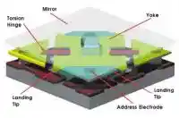 Основой проекционной системы на базе технологии DLP, в которую входят управляющие матрицей микрозеркал процессор и память (рис. 21), является элемент DMD (Digital Micromirror Display — цифровой дисплей на основе микрозеркал; иногда компонент называют Digital Micromirror Device — цифровое микрозеркальное устройство). Сам блок Digital Micromirror Display как раз и включает множество миниатюрные зеркалец (рис. 19), которые используются для управляемого отражения падающего на них света. Общая структура зеркального отражателя DMD выполняется на полупроводниковых элементах. И в некотором приближении подобна схемам, используемым для управления ЖК-матрицами. Однако вместо ЖК-ячеек, «экран» DMD покрыт микрозеркалами, имеющими многослойную структуру (рис. 22, 23), благодаря которой над зеркалом можно выполнять манипуляции по изменению его ориентации в пространстве. Как правило, современный элемент DMD содержит матрицу с керамической основой, на которой закреплена на «ножках-шарнирах» элементная база, состоящая из сотен тысяч и даже миллионов квадратных зеркалец со стороной порядка 4 мкм. (Старые модели имели сторону зеркалец в 16 микрон, при этом расстояние между зеркалами (именно здесь «теряется» свет) не превышало 1 микрон, благодаря чему уже тогда потери света в DMD-матрице не превышали 10%.).