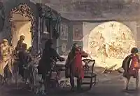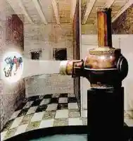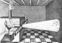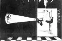 Первыми «профессиональными» и массовыми проекционными устройствами можно считать появившиеся в XVII веке волшебные фонари (рис. 3), принцип работы которых вы можете понять из рисунка 4. Такие аппараты широко использовались в Европе (рис. 5). Особенно они были популярны у бродячих артистов, демонстрирующих «темной» провинциальной публике невиданное световое зрелище (рис. 6). Не менее популярными оказались волшебные фонари и у всевозможных проходимцев, «разводивших» доверчивую публику в те далекие времена. Ведь с помощью подобного устройства они легко добивались появления реалистичных «привидений», «духов», «скелетов» (рис. 7) и прочей чепухи, причем часто изображение перед публикой «двигалось», что достигалось путем подсвечивания невидимых людям в темноте струй дыма, и т.п.
