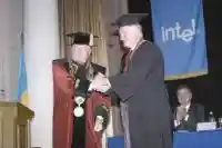 Мероприятие в стенах КНУ открыл ректор университета Виктор Скопенко. Он рассказал присутствующим о сотрудничестве КНУ с корпорацией Intel, а также о личных заслугах Крейга Барретта. Он также проинформировал гостей, что кафедрой полупроводниковой электроники радиофизического факультета «за значительный личный вклад в развитие информационных технологий, которые определяют современный уровень науки», было выдвинуто предложение присвоить Крейгу Барретту степень почетного доктора КНУ, что было единогласно поддержано. Далее в торжественной обстановке Виктор Скопенко вручил соответствующий диплом Крейгу Барретту (по традиции они были облачены в соответствующую мантию и головной убор).