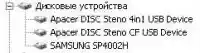 После того, как была честно сымитирована ситуация а-ля «в чистом поле без ПК», нужно было взглянуть на результат труда и дать ему оценку. Естественно, для этого понадобилось подключить СР100 к компьютеру. Windows XP отрапортовала о новых устройствах в системе. В диспетчере устройств появились три новых пункта: MATSUSHITA UDJA360 USB Device (рис. 6), Apacer DISK Steno 4in1 USB Device и Apacer DISK Steno CF USB Device (рис. 7). Под Win XP дополнительные драйверы не нужны, а для Win98 таковые имеются на диске, идущем в поставке с приводом.