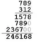 Мы умеем складывать, значит, мы умеем умножать! В самом деле, 3210000 значит «прибавить 32 к нулю десять тысяч раз». Но если вы таким образом будете реализовывать метод TLargeNum.Mul, вы рискуете быть сожженным на костре паладинами Ее Величества Оптимальности :-). Конечно же, умножать мы будем тоже в столбик.