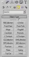 Несколько слов относительно возможностей этого модуля. Чтобы понять, что означает термин «динамика в сцене», приведем такой пример. Допустим, вы захотели создать простую сцену, в которой мячик падает на пол. В реальной жизни этот мячик должен несколько раз подпрыгнуть, причем каждый последующий раз он подскочит на более низкую высоту. Если вы решите делать такую сцену при помощи ключевых кадров, вам придется потратить большое количество времени. Во-первых, необходимо точно угадать временные промежутки между ключевыми кадрами, а во-вторых, потребуется подобрать положение мячика относительно пола в каждом ключевом кадре. Согласитесь, задание не из легких! Заметьте, что сцена — очень проста, и объектов в ней только два. Если же представить себе сцену, в которой таких мячиков с десяток, то создание анимации с расстановкой ключевых кадров вручную окажется и вовсе непосильной задачей. Используя такой мощный инструмент, как Reactor, эту сцену можно просчитать за пару секунд, причем все ключевые кадры будут созданы автоматически, практически без участия пользователя. Функциональные возможности Reactor’а довольно широки. Он может просчитывать трехмерную анимацию соударения тел, имитировать поведение мягких объектов (ткани, резины и т.д.), создавать жидкую поверхность, работать со сложными составными объектами и пр. Значение данного модуля в программе столь велико, что уже по умолчанию интерфейс 3ds max 6 в левой части окна содержит вертикальную панель инструментов Reactor.