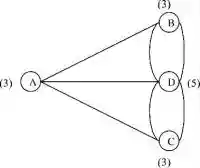 Пусть A, B, C, D — вершины, соответствующие частям Кенигсберга. Ребра графа представляют собою мосты, которые соединяют разные части города. Возле каждой вершины в скобочках указана ее степень — количество мостов, которые соединяют эту часть города с соседними частями. Идея доказательства невозможности такого маршрута состоит в следующем: при посещении каждой вершины мосту, по которому мы вошли в часть города, должен соответствовать мост, по которому мы ее покинем. Другими словами, количество ребер, инцидентных каждой вершине должно быть четным, что и доказал Эйлер в своей теореме, огорчив всех своих предшественников. Вот такая вот грустная история :-).