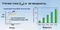 **Утечки —**поток электронов, проходящий через диэлектрик затвора. В идеальном случае диэлектрик затвора действует как совершенный изолятор. Но поскольку этот слой очень тонкий, через него происходят значительные утечки. В результате этого транзистор потребляет большее количество мощности, чем необходимо, поскольку его эксплуатационные характеристики нарушаются. Здесь напрашивается аналогия со сломанным краном, из которого постоянно капает вода (кран «протекает»), — это просто очень расточительно.